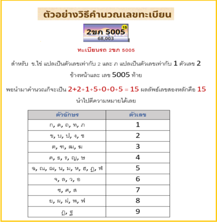 คือการแปลงค่าตัวอักษรให้เป็นตัวเลข แล้วจึงนำตัวเลขทั้งหมดมาบวกกัน โดย หมวดอักษรทะเบียนรถแปลเป็นตัวเลข จะมีดังนี้