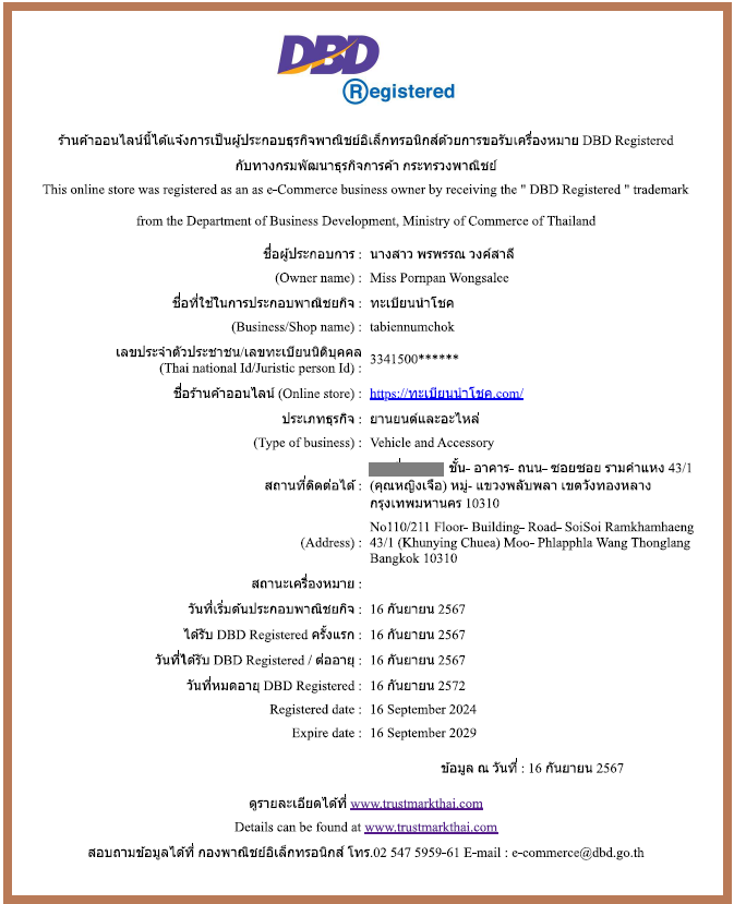 ร้านทะเบียนนำโชค ได้รับเครื่องหมายรับรองจากกรมพัฒนาธุรกิจการค้า กระทรวงพาณิชย์ ว่าเป็นผู้ประกอบธุรกิจพาณิชย์อิเล็กทรอนิกส์ เกี่ยวกับ ทะเบียนรถยนต์ ในประเภทธุรกิจ ยานยนต์และอะไหล่ อย่างถูกต้องตามกฎหมาย